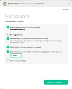 Uiteraard kan er worden afgeweken van de tekst in de knop of de kleur van de button worden aangepast (bijvoorbeeld op basis van de huisstijl van de salon).