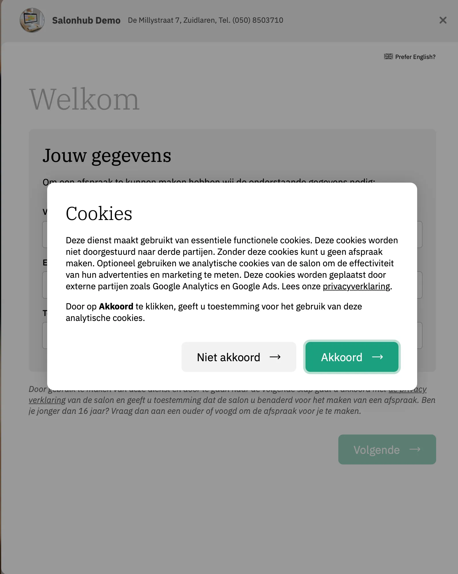 In de boekingswidget wordt eerst gevraagd om klantgegevens, zoals naam, e-mailadres of telefoonnummer. Omdat je dan persoonsgegevens verwerkt, is dat volgens de AVG (de privacywet) alleen toegestaan als de gebruiker goed is geïnformeerd.