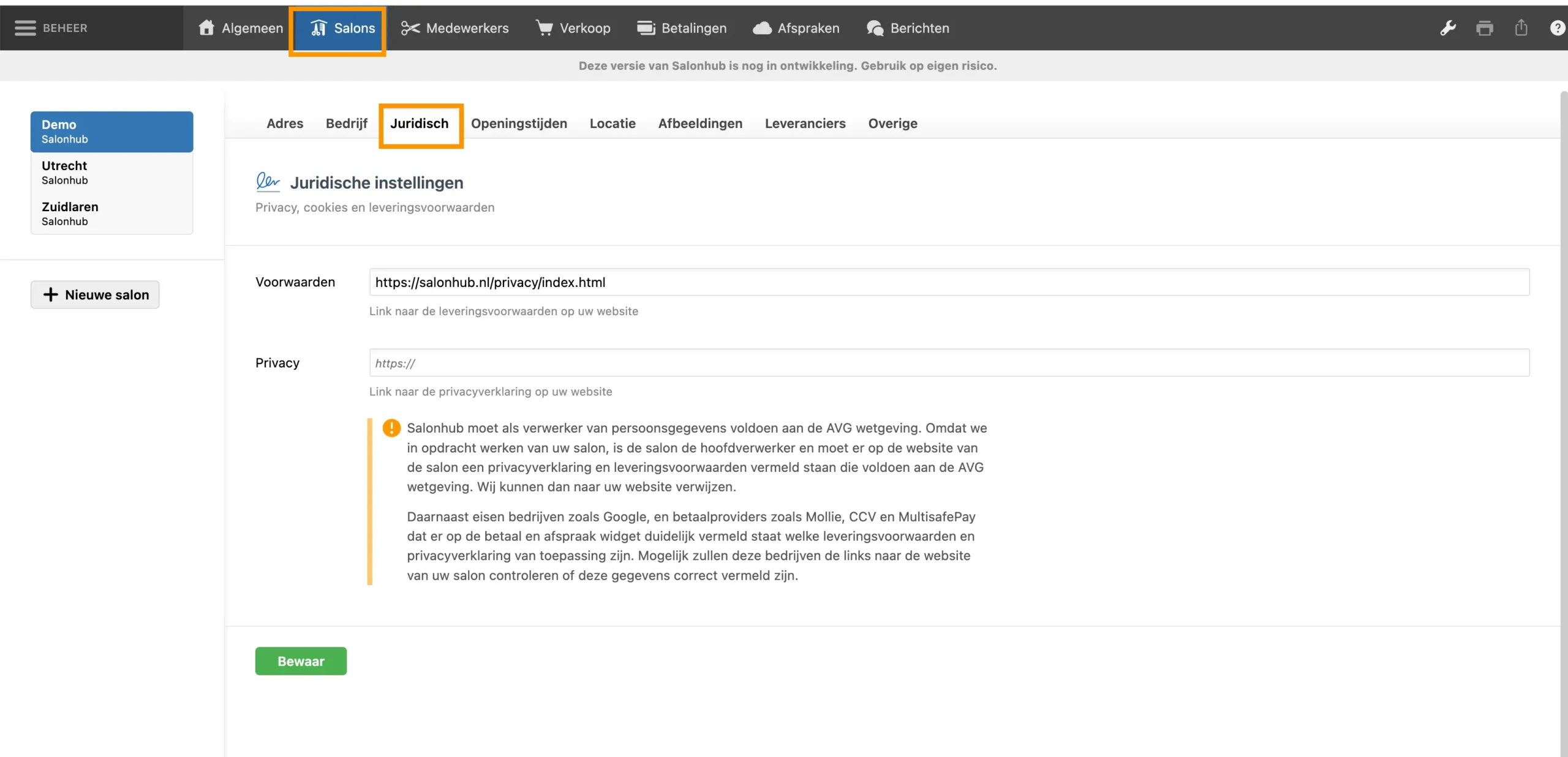 De salon zelf. Salonhub biedt alleen de mogelijkheid om de link naar de eigen privacyverklaring te tonen.