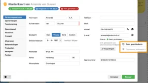Een nieuwe klant aanmaken is eenvoudig via het tabblad Klanten. Klik linksboven op Nieuwe klant om te starten. Tijdens het plannen van een afspraak of bij het afrekenen kan ook direct een nieuwe klantenkaart worden aangemaakt. Gebruik hiervoor de knop Nieuw onderaan in het klantenzoekvenster. Voer eerst de achternaam in; deze wordt automatisch op de juiste plek op de klantenkaart geplaatst. Vervolgens kan de voornaam worden toegevoegd.