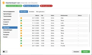 Aan de linkerkant vind je de optie “afspraken”. Hier zie je een overzicht van alle afspraken: toekomstige afspraken, eerdere afspraken en momenten dat de klant niet kwam opdagen. Klik op een afspraak om de geschiedenis te zien. Bonnen kun je altijd openen via “behandelingen” en “producten”.