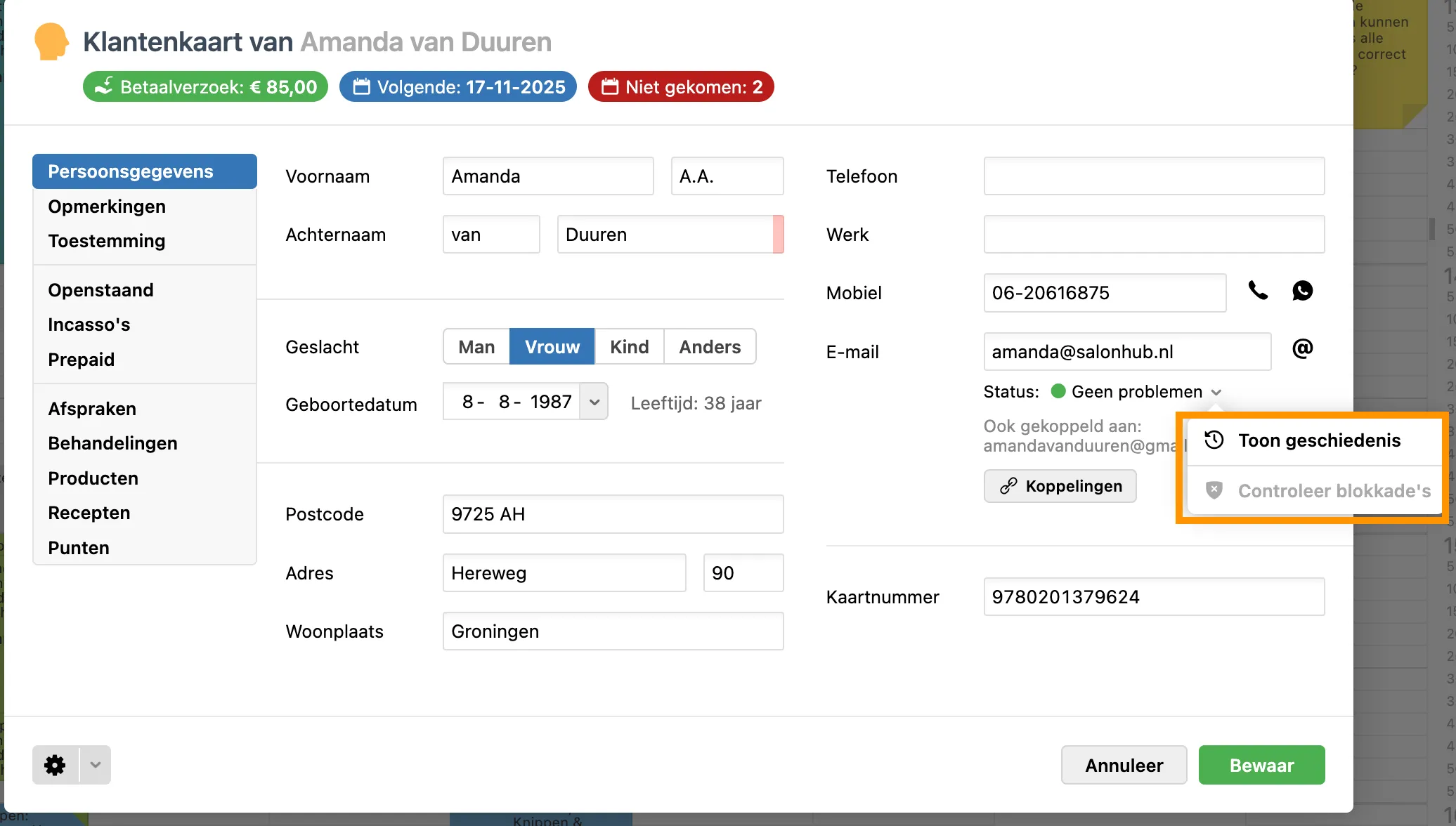 Bij een rood bolletje is er iets mis met het e-mailadres. Op de klantenkaart zie je de status van het e-mailadres. Bij problemen verschijnt een oranje of rood bolletje. Je kunt een menu openen om de geschiedenis en eventuele blokkades te bekijken.