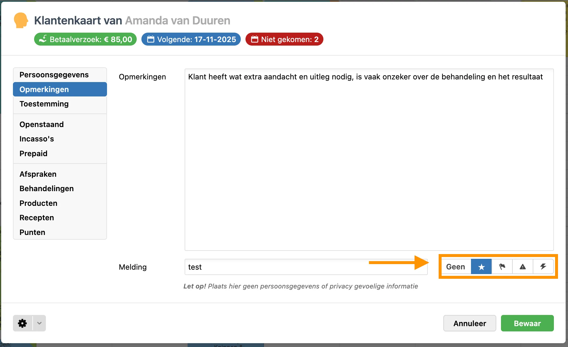 In het opmerkingenveld vind je de extra optie “melding”. Hier kun je belangrijke informatie invullen die zichtbaar is bij het maken van een afspraak en bij het afrekenen. Dit geeft extra aandacht als er iets bijzonders is met de klant. Is de tekst te lang? Verwijs dan naar het opmerkingenveld, waar je meer ruimte hebt. Zo zie je snel dat er iets specifieks speelt met deze klant.